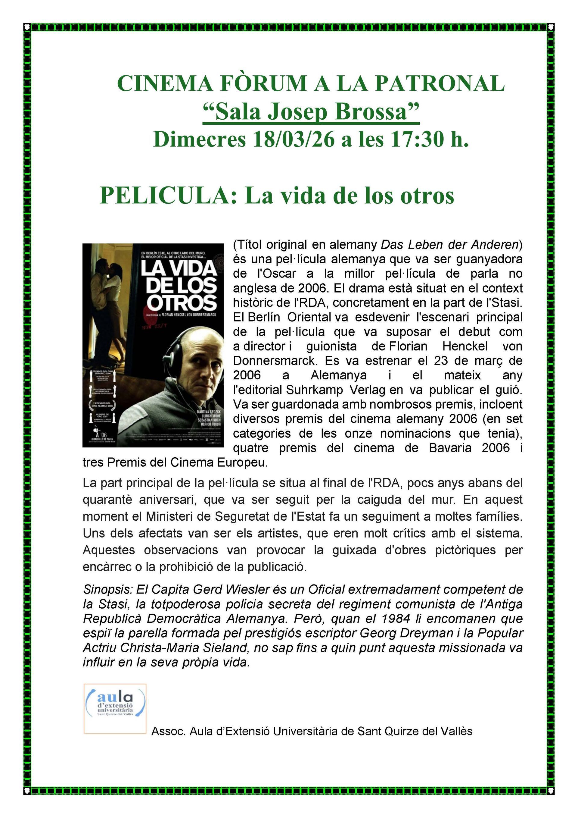 Recordatori de la propera sessió de Cinefòrum per aquest dimecres 29 de març a les sis de la tarda.