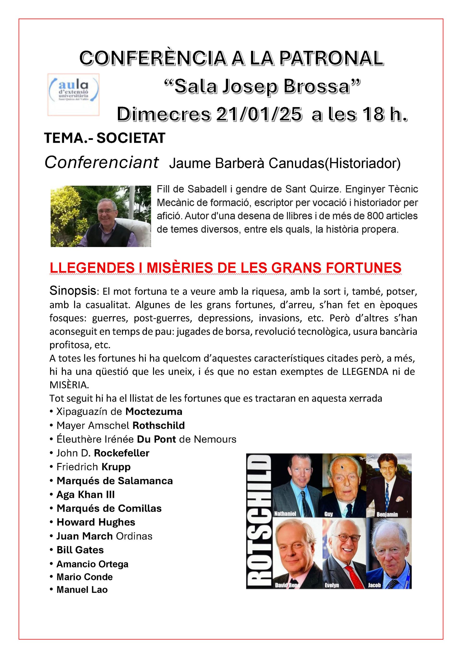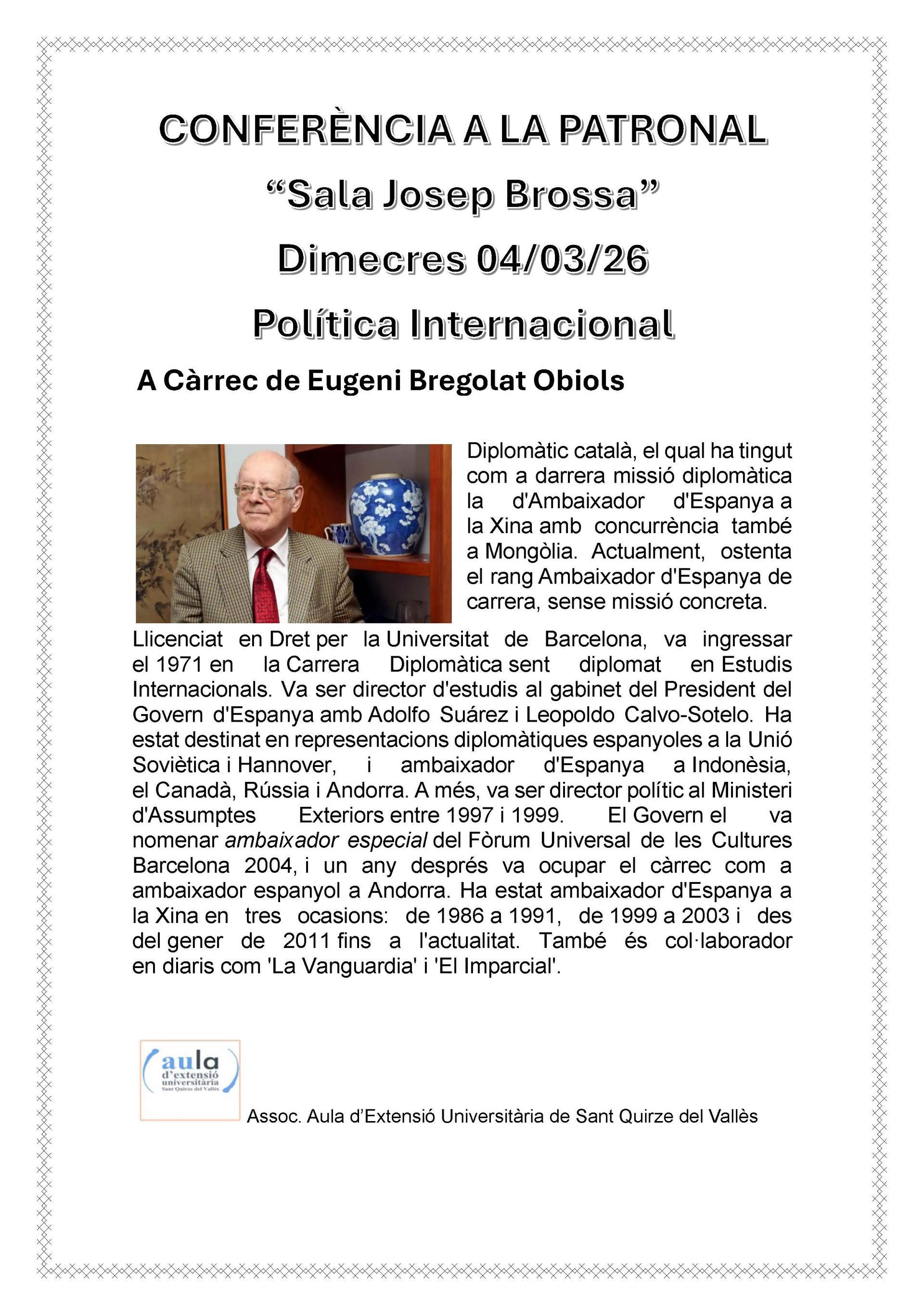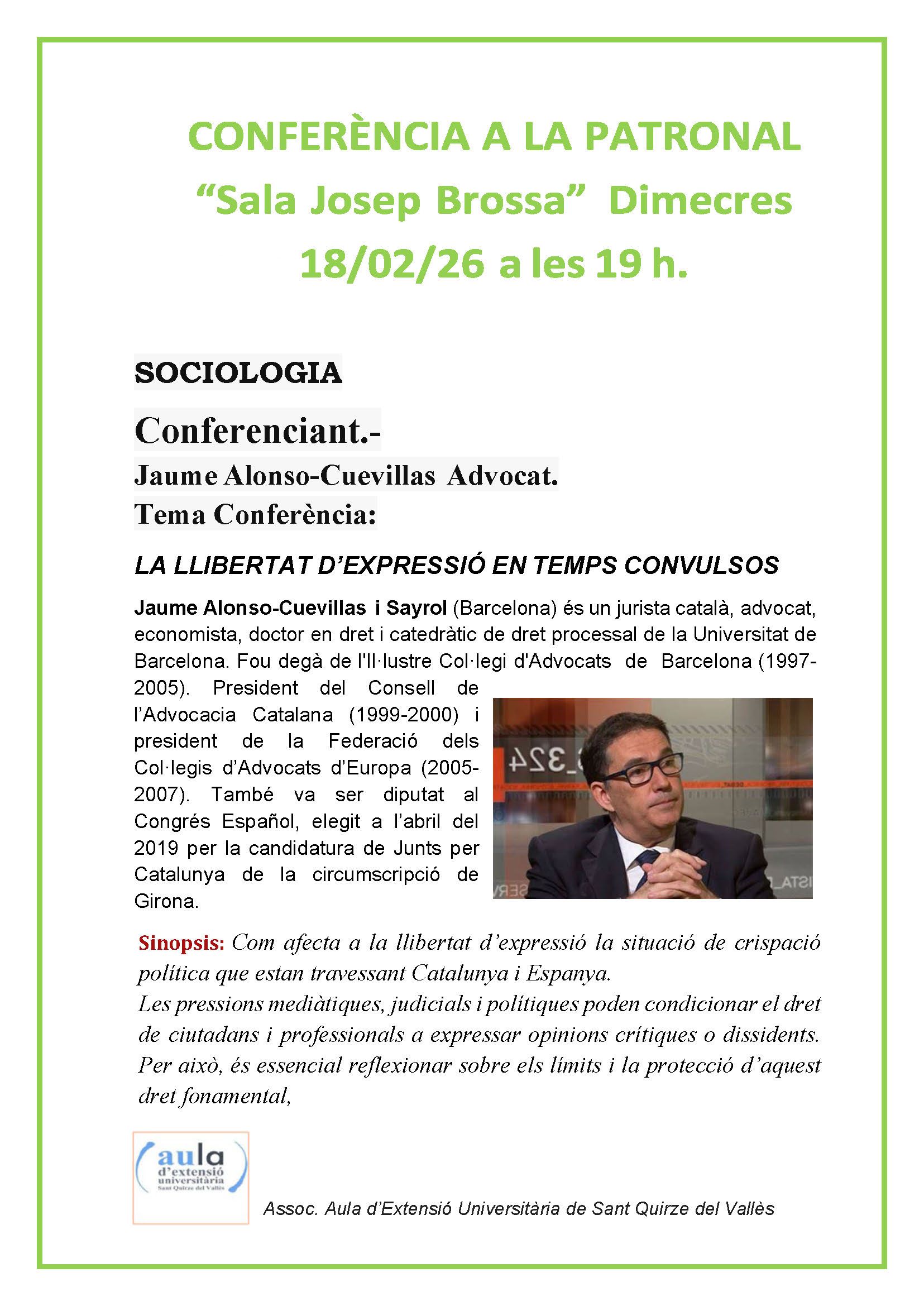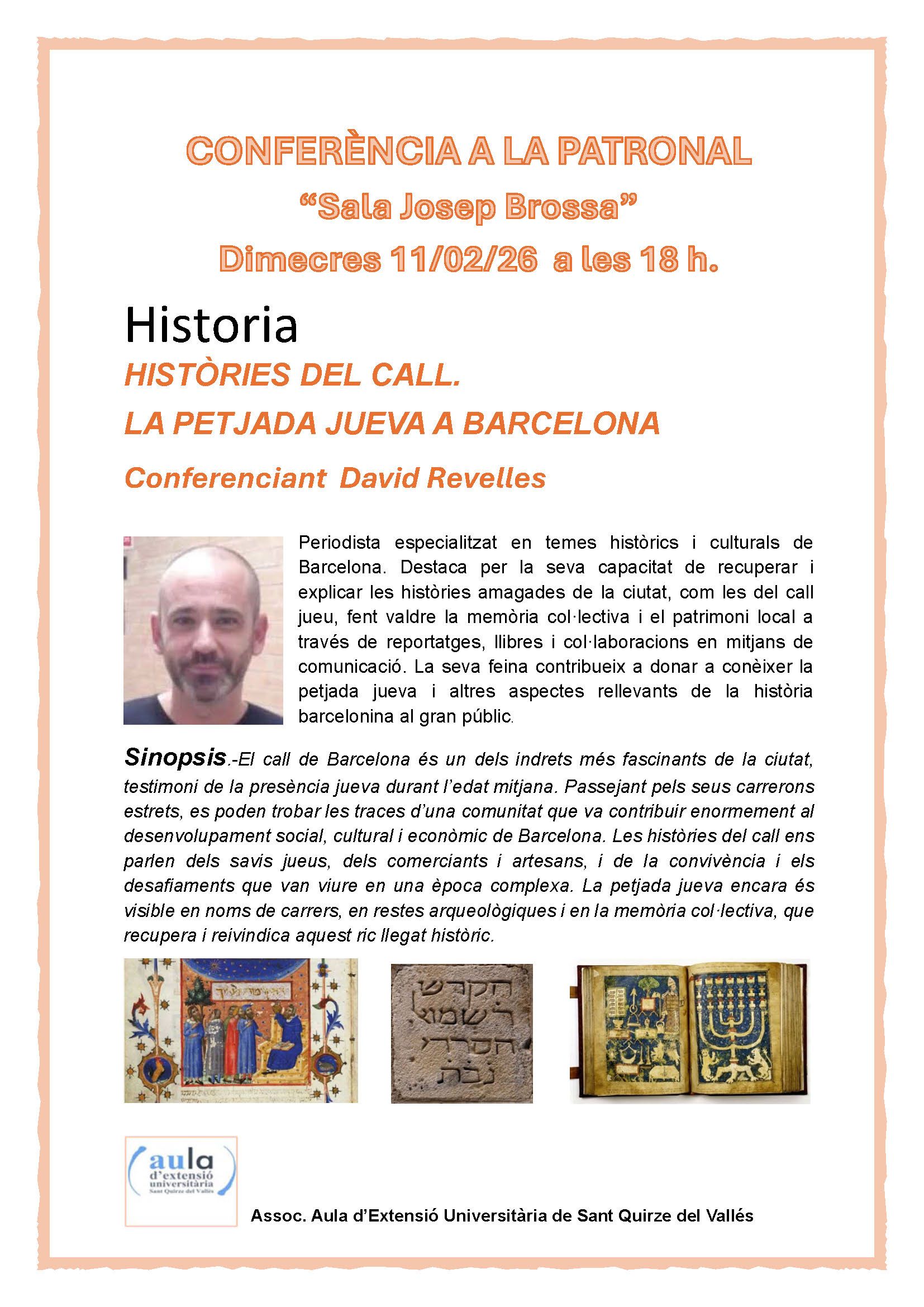 Hora : a les 18 hores Lloc : La Patronal Sala Josep Brossa